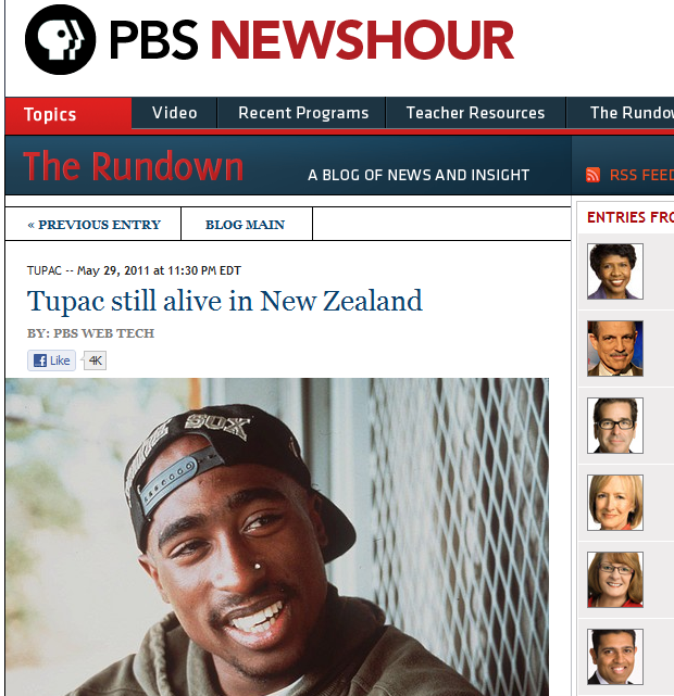 The hackers had managed to publish a fake report on the PBS website, claiming that legendary rapper Tupac was alive and well living in New Zealand (screenshot below).
