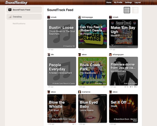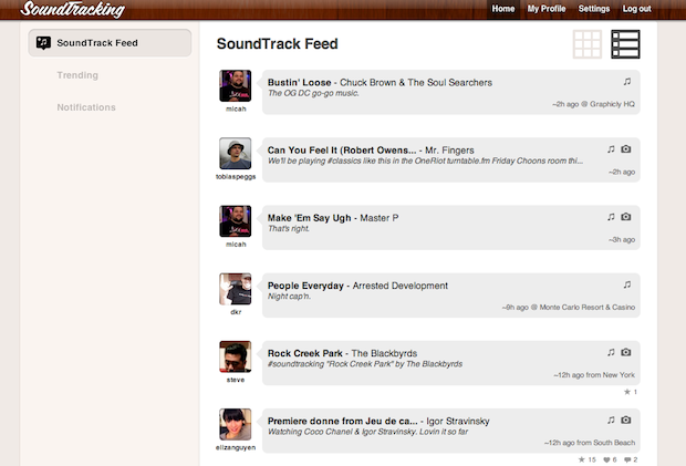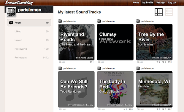 But the bigger improvement in the visual sense is the new SoundTracking website. While there is a traditional feed view where you can use SoundTracking just as you would with the app (liking, loving, commenting, etc), the more interesting view is the large image one. Jang calls this the postcard view, and it puts a huge emphasis on the images (either album artwork or your own images).