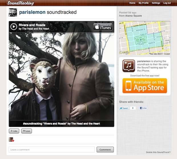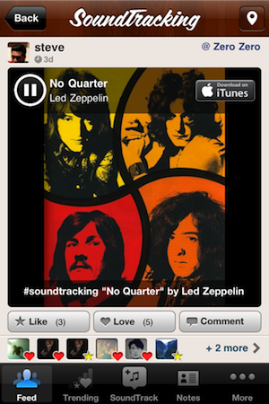 Improved location is one aspect of getting closer to the musical postcard, the other is the visual aspect. SoundTracking has also improved the music post view to place comments, likes, and loves cascading below the image. This leaves the image itself cleaner and more emphasized.