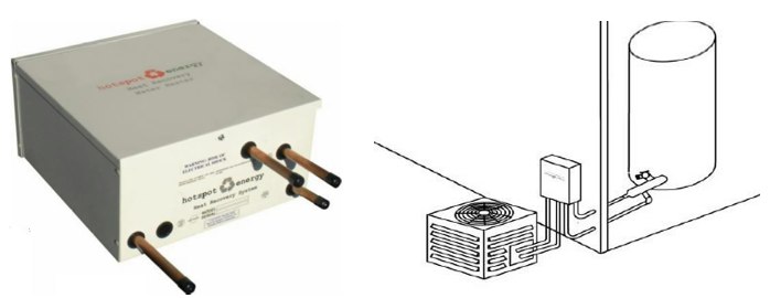 The aptly named Air Conditioner Water Heater, or ACWH, from Hotspot Energy has a condenser unit that sits outside of the building, collecting heat that the air conditioner compresses and expels from inside. The heat passes through a copper heat exchanger that connects to a home or building’s hot water tank. According to the company, the unit can cool a 1000-square-foot room and heat about 100 gallons of water per day. At its peak, the ACWH can provide 18,000 BTU, or 1.5 tons of cooling using 1333 watts per hour.