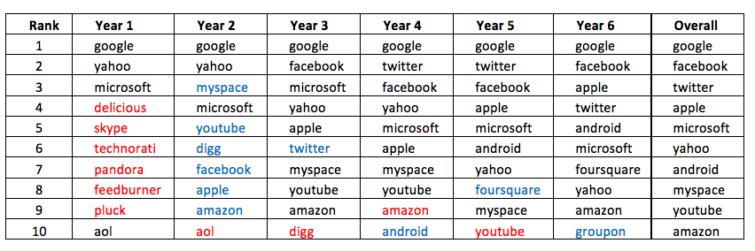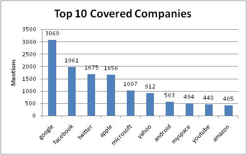 The top ten has changed a bit each year, though Google has always been #1. Google has been covered in 1000 more stories than #2, Facebook.