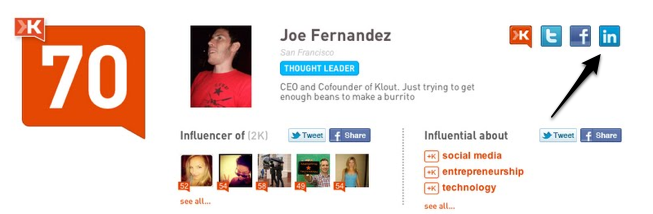 Founder and CEO Joe Fernandez says that LinkedIn integration was one of the most requested features for Klout users. The company says that some users aren’t as active on Twitter, but are active on LinkedIn, and this is a way to make Klout scores more accurate. But in case you don’t really engage on LinkedIn, Klout says that your overall influence score won’t go down. In most cases users will see a score increase, even for infrequent LinkedIn users, says Klout.