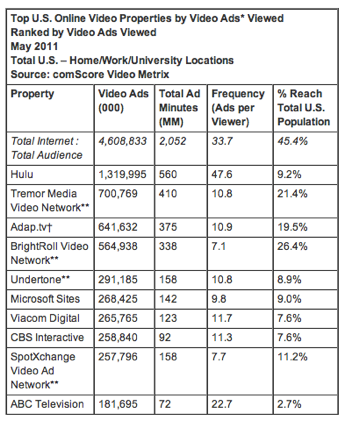 Video ads reached 45 percent of the total U.S. population an average of 34 times during the month. Hulu also delivered the highest frequency of video ads to its viewers with an average of 48 over the course of the month.