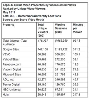 comScore says Google sites (a.k.a. YouTube) was again the top video property in May with 147.2 million unique viewers, 2.17 billion viewing sessions and an average of 311 minutes spent per viewer on the site (that’s an average of 5 hours spent per view in May).