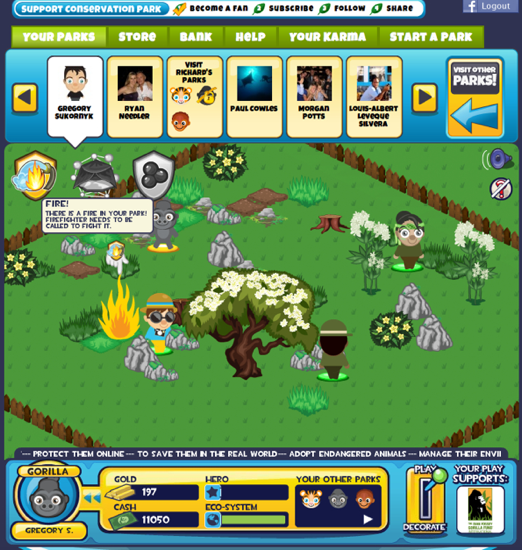 All purchases of virtual goods directly benefit Good World Games’ non-profit partners with 15% of in-game purchase revenue donated to select causes. Each park benefits a different partner, which include Dian Fossey Gorilla Fund, Sea Shepherd, Wildaid and Orangutan Outreach. You can see what percent of revenue from your game interactions have been donated as well.