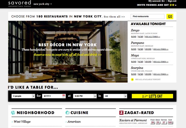 Savored focuses on high-end dining discounts at top-rated Zagat restaurants. But the model is slightly different than your run-of-the-mill daily deals site. Members pay $10 per reservation, and get a flat 30 percent off food and drinks. Unlike Groupon or LivingSocial, merchants get to keep everything after the discount instead of splitting that with Savored. Savored makes money by charging $10 per reservation (so the deals are only appealing at restaurants where it is worth paying $10 to get 30 percent off).