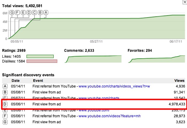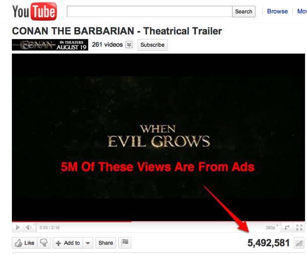 The same movie trailers are also promoted through various means and shown as prerolls before other videos or via paid links and those views can also count towards the total. For instance, this trailer for the new Conan The Barbarian movie has been watched nearly 5.5 million times. If you click on the statistics right next to that number, you will see that 4.98 million of those views come from ads (see also below).