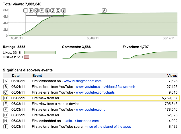 This is not an isolated incident. The trailer for Rise of the Planet of The Apes shows 7 million views, but nearly 5.8 million of those ad views. In this case, the statistics are hidden, but I got my hands on them (see second image below). Same for this X-Men trailer: 2 million out of 2.4 million views are ads (although this one is literally a 15-second teaser, not a full two-minute trailer like the other ones I’ve cited).