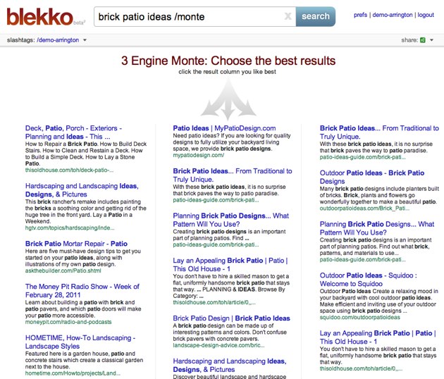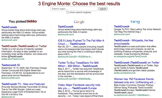 But enough tech jargon. The proof is in the pudding, they say, and Blekko just served some pudding. Try out their new tool called 3 Engine Monte (derived from the popular 3 Card Monte confidence game.