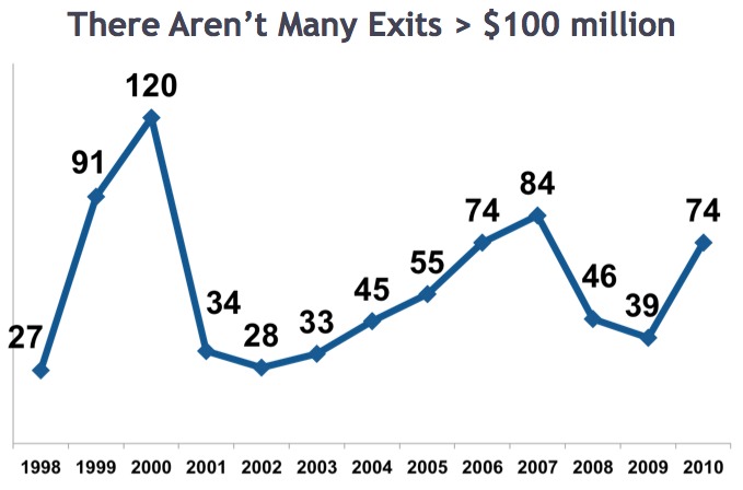 In any given year there are about 50 venture-backed companies or so that are bought for $100 million or more. And for many of these they were (over) funded 7-10 years ago and don’t necessarily all represent great returns for investors or founders. I would guess (I don’t have the data) that less than 5 companies / year are purchased above $100 million that have been funded within 5 years of the being started and have raised less than $10-15 million in capital.