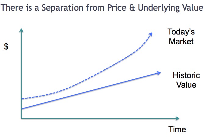 I believe a bubble occurs when a market is willing to pay greater than intrinsic value for an asset class. That asset class need not represent the broader market. As any historian of bubbles will tell you – there were periods of bubbles in assets as arcane as tulips, South American trading companies, dot-com bubbles & housing bubbles. They are often bound by geographies and asset classes. But they also often have a rippling effect on broader markets as all of our economies seem to be intertwined these days. I said that at the Founder Showcase, too.