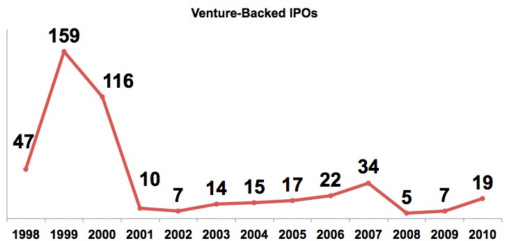 And as you probably guessed the data aren’t any better on IPOs with less than 20 / year average for the past 10 years. Yes, everybody expects a continued uptick given the euphoria of LinkedIn & Pandora and long anticipated Facebook, Zynga, GroupOn and one day, Twitter. But it’s not enough to justify over-paying for deals.