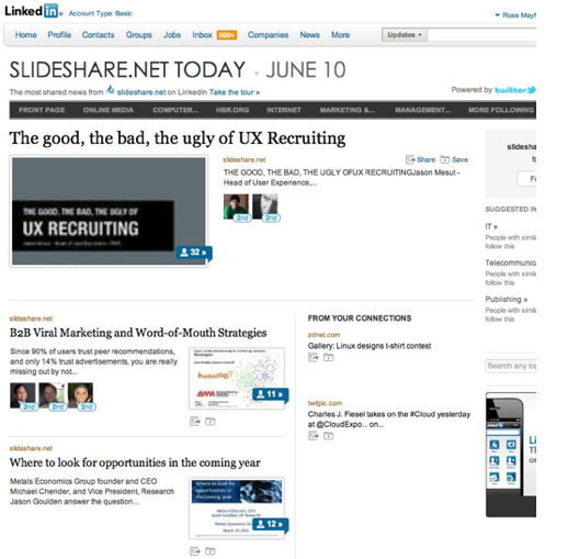 LinkedIn is also adding SlideShare content to its social news reader LinkedIn Today. As we wrote in March, LinkedIn Today aggregates the most shared news from professionals in your network. Now SlideShare content that is actively shared on the network can also be found in the news reader. And SlideShare is the first source of content in LinkedIn Today that isn’t from a publisher, but is user-generated.