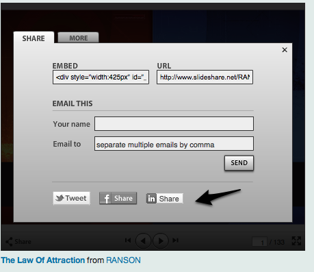 First, SlideShare has added a LinkedIn Share button, which is similar in functionality to Twitter’s Tweet button, to all SlideShare presentations, documents, and videos, so you can share content with your professional network in your stream. The button joins Twitter and Facebook buttons, all of which will be available on content both on SlideShare as well as embedded SlideShare content on blogs.