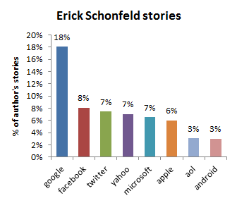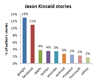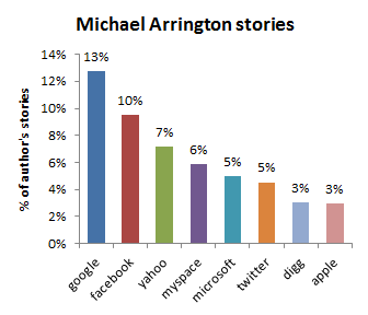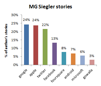 All TechCrunch writers publish the most stories about the same ten or so large companies, with one story often covering multiple companies. Within these top companies, some writers do have favorites, and one data point stands out: two-thirds of MG Siegler’s posts are about Google, Apple, and Twitter. MG covers Twitter twice as much and Apple three times as much as any other writer. (The percentages in his chart add up to more than 100 because multiple companies are often tagged in the same post).