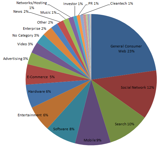 CrunchBase categorizes the markets of companies and not surprisingly, TechCrunch’s most covered companies are tagged as general consumer web. This includes portals like Yahoo and AOL, browsers like Mozilla and Chrome, and other non-specific markets. The next most popular markets are social networks, search, and mobile. CrunchBase’s category data is messy and most large companies like Apple could be classified several ways so this data is not precise (see pie chart at top).