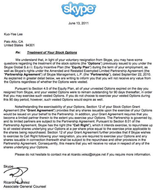 Skype did things differently. With Skype stock options the company has the right to not only terminate unvested options, but also vested ones. And any vested options that you’ve exercised (meaning you paid cash for them) that were turned into actual shares could simply be bought back by the company at the price you paid, regardless of their current value.
