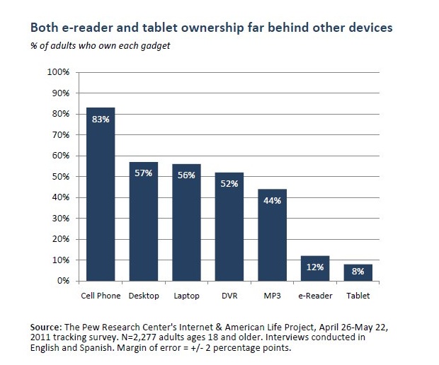 Both tablets and e-readers still trail well behind ownership of other digita devices such as MP3 players (44 percent), DVRs (52 percent), laptops (56 percent), desktops (57 percent), and cell phones (83 percent). This is also the first time in this survey that laptop and desktop ownership reached parity.
