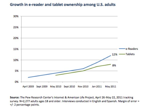 A new Pew research survey of U.S. adults conducted in May, 2011 shows that ownership of electronic readers such as the Amazon Kindle or The Barnes & Noble Nook is now at 12 percent. The ownership of e-readers doubled from six months prior when it was 6 percent.