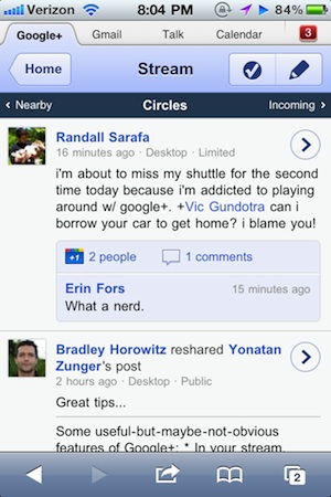 The app is solid enough that it might be acceptable as a native app replacement if it did actual notifications. Alas, that’s not possible. And that will be a big part of the Google+ iPhone app, especially with the revamped notifications coming in iOS 5. There are mobile web notifications that are pretty nifty (a red box in the upper right corner), but you have to have the app open to see them, obviously.
