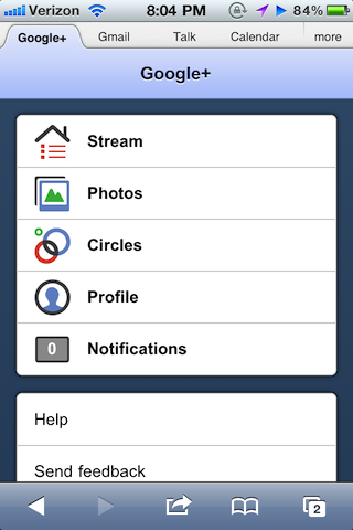 If you simply point your iOS Safari browser to plus.google.com, you’ll find a solid web app written in HTML5. You can’t do quite everything you’ll be able to with the native app, such as Huddle (group chat). But it the main parts of the Google+ functionality are there. Stream, Photos, Circles, Profile, and Notifications appear in the main menu.