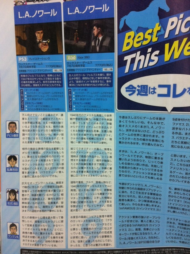 Who said Japanese players don’t appreciate video games made outside their home country? I just went out to buy the newest issue of the Famitsu, Japan’s leading video game magazine (which came out about 3 hours ago/it’s currently 3am Thursday over here), and saw what you see above: L.A. Noire, one of the biggest game titles this year, missed the perfect review score by just one point.