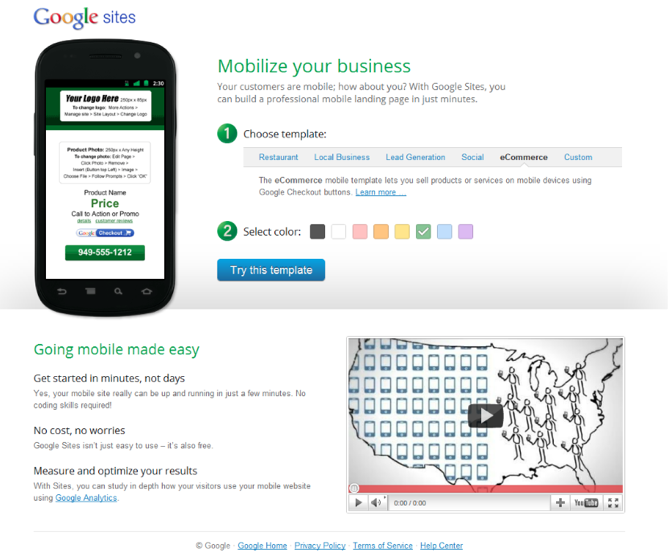 Similar to templates for Google Sites web pages, Sites for Mobile allows users to pick a template that suits the consumer’s needs. For example, Sites offers and e-commerce template for users who want a mobile site to sell products (via Google Checkout). Google also offers customer mobile templates for local businesses, restaurants, lead generation and social.