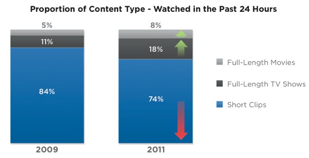 Not surprisingly, people are watching longer form videos online (see chart below). Today, 18 percent of online videos watched are full length TV shows, versus 11 percent two years ago. And 8 percent are full-length movies, up from 5 percent in 2009. Meanwhile, the percentage of overall video content made up of short clips watched online declined by 10 points from 84 percent to 74 percent.