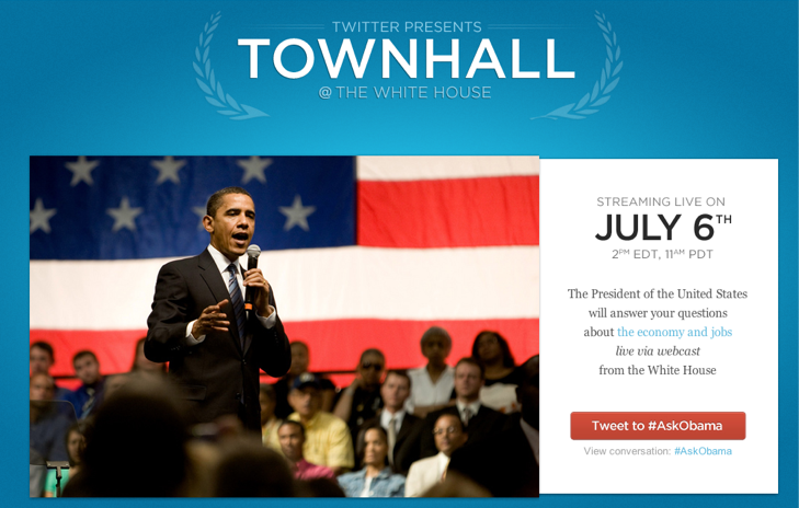 The President’s town hall, which will take place July 6 at 2 pm ET, will focus on the economy and job creation. People will be able to participate by Tweeting questions with the hashtag #AskObama, and can follow @Townhall for updates. Via a Twitter-hosted site, you can also watch President Obama respond live via webcast. Twitter co-founder Jack Dorsey will moderate the meeting.