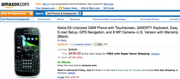 The Nokia E6 saw a $7 price-cut as it became available today on Amazon’s site, listed at $439 instead of its pre-order price of $446. The unlocked, SIM-free phone is available and in-stock, and shipping is free from Amazon. The unbranded Nokia E6 will work with both AT&T and T-Mobile’s networks, and with a pentaband 3G radio on board, the E6 can get 4G support, too.