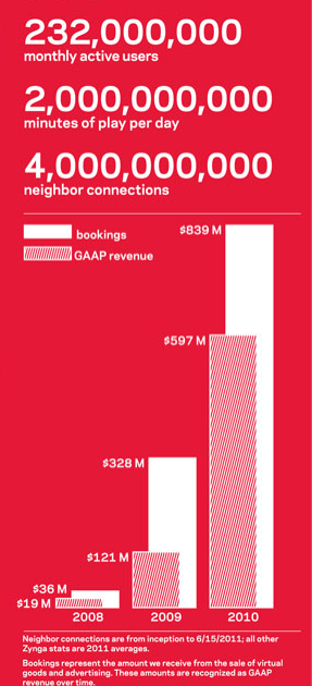 According to the filing Zynga has 60 million daily active users in 138 countries. 38,000 virtual items are created every second and game players spend 2 billion minutes a day on Zynga games. The company had $597 million in revenue in 2010, and posted revenue of $235 million in the first quarter of 2011.