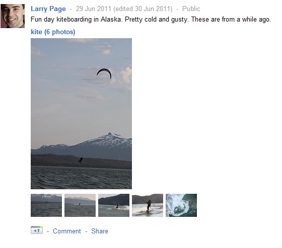 That’s why it’s discombobulating to see these come together in Google+. I’ll see a message about my friend Wanita’s travel plans next to pictures from Larry Page’s Alaskan kiteboarding adventure. If I comment on Nita’s travel plans, I’m confident I’ll get a response. That’s not nearly as likely if I comment on Larry’s trip. (For those that don’t know, Larry and I were in the same high school class — we used to debate Amiga vs. Mac and talk about googol.) I can’t think of many real world equivalents where you have such disparities in relationships next to each other. It’s jarring going back and forth between these worlds.