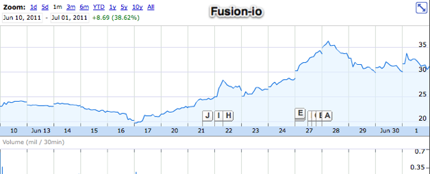 Fusion-io’s stock has performed fairly well over the past month, reaching a high of $36.32 last week. The company’s shares closed at $31.19 on Friday, up 64 percent from its initial pricing.
