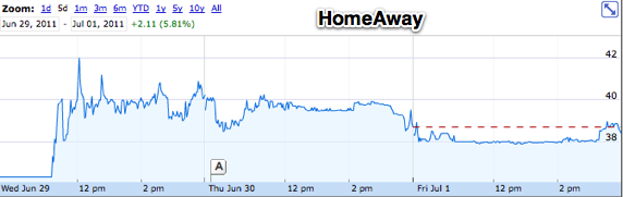 HomeAway’s shares have maintained its value, relatively speaking, in its first week of trading, reaching a low of $34.92 and a high of $42.30. On Friday, HomeAway’s shares closed at $38.42, a 42 percent increase from the stock’s pricing.