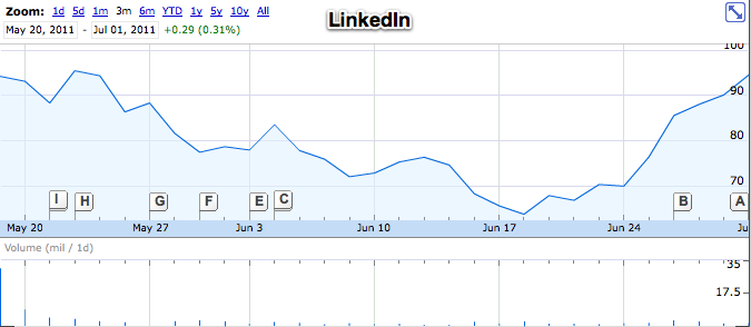 But these high stock prices didn’t sustain and LinkedIn’s value per share dropped significantly over the next month, dropping as low as $63.71 per share. However, the company’s stock rebounded last week, with shares rising as high as $95.50 on Friday, eventually closing at $94.54. That’s a 110 percent increase from its initial pricing.