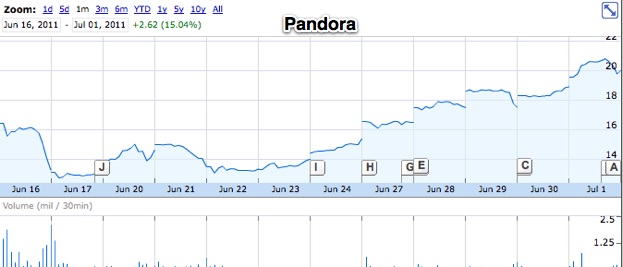 In the two weeks following the IPO, Pandora’s stock took a bit of a dive, reaching as low as $12.16 per share. But like LinkedIn, Pandora’s shares saw an uptick over the past week, closing at $20.04 on Friday, which is up 25 percent from the company’s initial pricing in June.