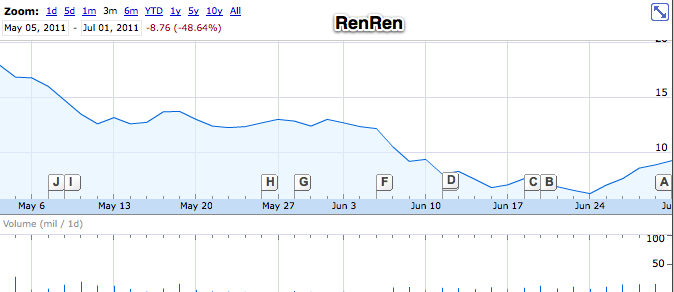 RenRen opened at $18 per share, but the stock has since plummeted to as low as $6.23 per share. On Friday, RenRen closed at $9.25 per share, which is a 34 percent drop in value from the initial pricing.