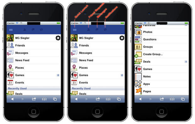 The blue bar along the top is referred to as “chrome” (yes, it shares a name with a Google product). Developers say it’s the glue that binds all the different mobile sites together. That’s one key — these HTML5 apps are said to reside elsewhere, not on Facebook’s own servers (at least right now). So instead they have to make external calls to pull in the Facebook “chrome” to make the apps look like proper Facebook apps.