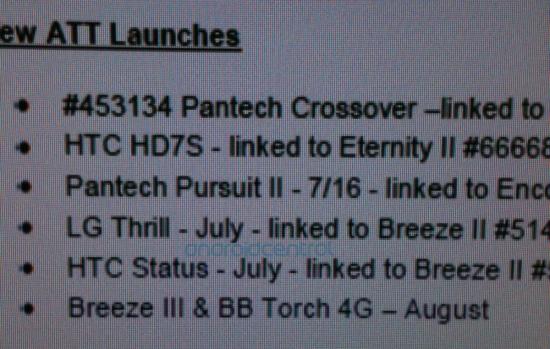 If the snap up above (purportedly pulled from an internal memo from… somewhere. Oddly, this same memo contained launch info for devices from multiple OEMs, across multiple carriers. What is this witchcraft?) obtained by Android Central is legit, we’ve at least got a down-to-the-month idea of when to expect these two handsets: July. Yep! Sometime this month you’ll be able to use the Thrill 4G’s glasses-free 3D feature one time and then forget it exists on a handset of your very own!