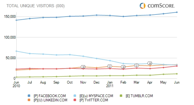 Professional social network Linkedin surpassed Myspace in terms of traffic to become the No. 2 most visited social networking site in the U.S. in June. LinkedIn, which has seen a resurgence of traffic after its IPO in May, reached an all-time high of 33.9 million unique visitors in June compared to Myspace, which saw 33.5 million unique visitors (that’s down from 34.9 million in May). Hopefully Myspace’s new owners can recharge the troubled social network.