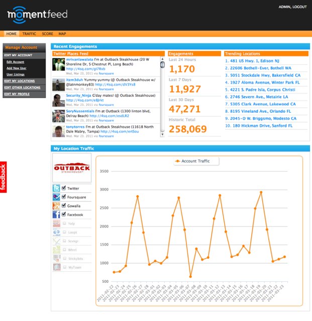 MomentFeed pulls in merchant location data from Foursquare, Facebook, Twitter, and Gowalla, and gives retailers a unified view of all the check-ins, deals, and specials across their locations nationwide. (It is also built on Factual’s location data, which helps to harmonize locations between services). With one dashboard, a retailer like 7-Eleven or a fast-food chain can see that maybe more people are checking in with Foursquare in New York, but with Facebook Places in the midwest and adjust their targeting accordingly. “We are built on the place signal, instead of the keyword as the primary signal,” says CEO Rob Reed.