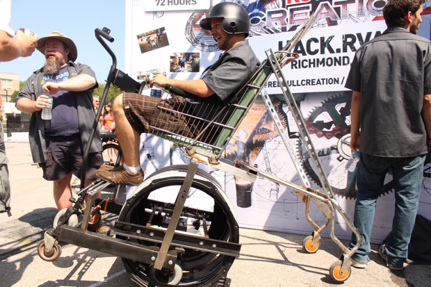 Creation: A hacked up shopping cart that does its own hardcore poppa-wheelies, fittingly named the Wheelie Mobile.