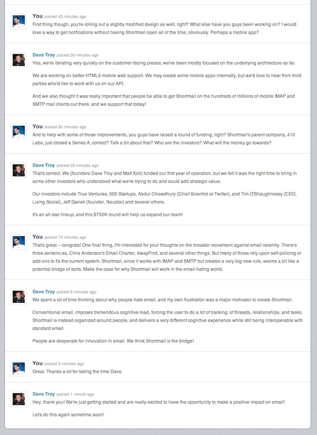 But it’s not just Twitter for email. There are other interesting elements of the service too. For example, you can set any Shortmail conversation to be private or public. The latter feature I tested out yesterday with 410 Labs (the company behind Shortmail) co-founder Dave Troy. Below, find my Q&A back and forth with him. (They don’t currently have embeds, so I took screen shots of it to include in this post. But you can find the thread live on the web here.)