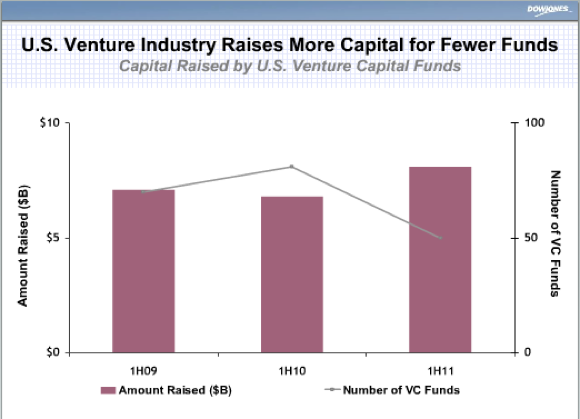 Dow Jones is reporting mixed numbers for venture fundraising this morning, releasing data that shows that capital raised for U.S. venture funds rose 20 percent over the same period a year ago, to $8.1 billion. But that stat comes with a caveat— the number of funds that held closings plummeted 38% to 50 funds. Seven firms were responsible for raising the bulk of the $8.1 billion, raising almost 80 percent of the total, or $6.3 billion. For basis of comparison, in the first half of 2010, 81 U.S. venture funds raised $6.8 billion. This trend was illustrated in this morning’s Thomson Reuters and the National Venture Capital Association report.