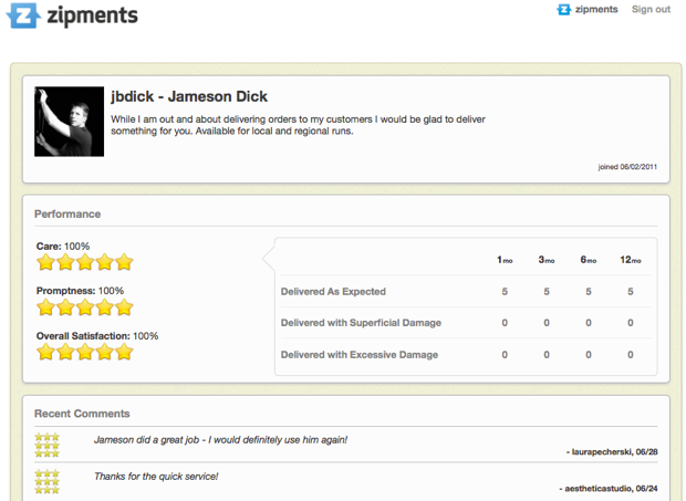Of course, that comes with a tradeoff: Zipments isn’t doing much to guarantee that your order will be completed properly (there’s a small risk that someone could actually run off with whatever you want delivered). The service does a few things to address this — you need a Paypal account to register, for example, so users aren’t anonymous. And each user has a profile where you can leave a poor review if you have a bad experience. But for the time being, even the company isn’t recommending that you use this to transport highly important or valuable goods. And in the future, they’ll be looking into offering insurance and bonding options for these more sensitive jobs.