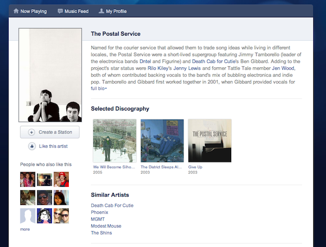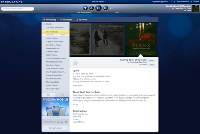 There is also a “My Profile” area to keep track of what you’ve been doing on Pandora. These profiles have actually existed for some time, but few used them as they were very static and uninteresting. Now they look great and are useful. Clicking on any users’ profile allows you to easily see their activity and to follow them. Their activity will then appear in your “Music Feed” stream.