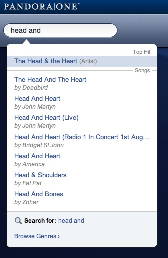 “Another core change is the way the station creation process works,” Conrad says, showing me that when you click in the new “Create a New Station” box, a drop-down appears to help you. As you type, you’ll get suggestions for stations to create. These include bands, artists, genres, even comedians. And it’s not just keyword-based. Pandora will dynamically serve you recommendations based on the music genome core, your own voting and listening history, and social elements of the site.