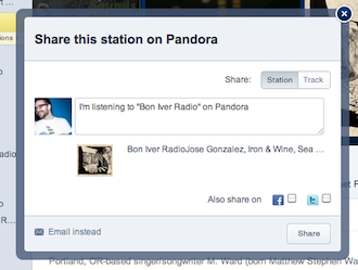 When you click on the “Share” button for each track on Pandora, you’ll still have the standard options to send to Facebook and Twitter, but the default is now to simply share on Pandora itself. For example, you can share what station you’re listening to and send that right to your music feed for all of your Pandora followers to see. “Pandora now has its own follower/following system,” Conrads notes. “We talked to our listeners and found that the vast majority are very conscious about spamming their friends on their other social networks. They’re more reluctant to share than I would have imagined,” he continues. “My hope is that as people develop followers on Pandora itself, they’ll become more comfortable with sharing in general.”