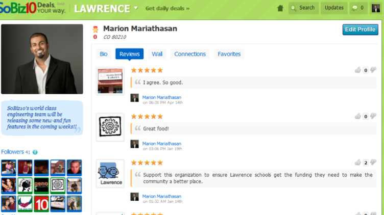 The other interesting part of the SoBiz platform comes from the fact that Founder and CEO Marion Mariathasan and team had originally built the service to be a social network, with a daily deal component as an add-on. As you can see from the image above, users and merchants can create profiles, just as one would on Facebook, write reviews of prior deals, connect with friends and merchants, and so on.