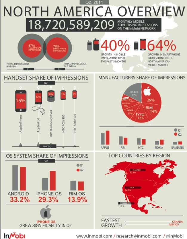InMobi, which served 18.7 billion mobile ads in North America in the second quarter, also reports on the breakdown by OS. Android leads with 33.2 percent, but it lost share to iOS which grew to 29.3 percent (RIM has 13.9 percent, also down). In January, Android had 37 percent share and iOS had 23 percent.